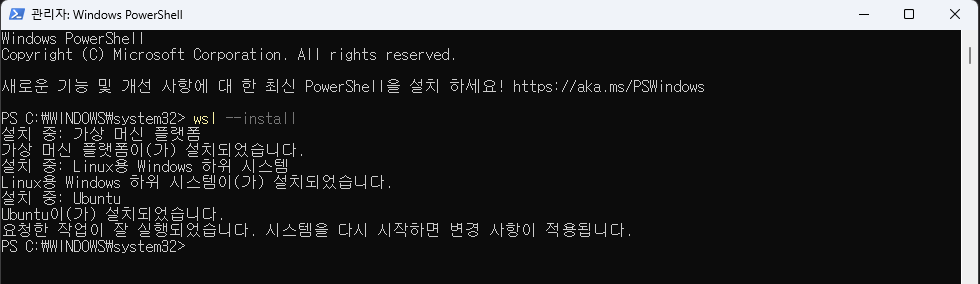관리자모드로 PowerShell 실행 후 아래 명령어 입력하여 wsl을 설치한다.